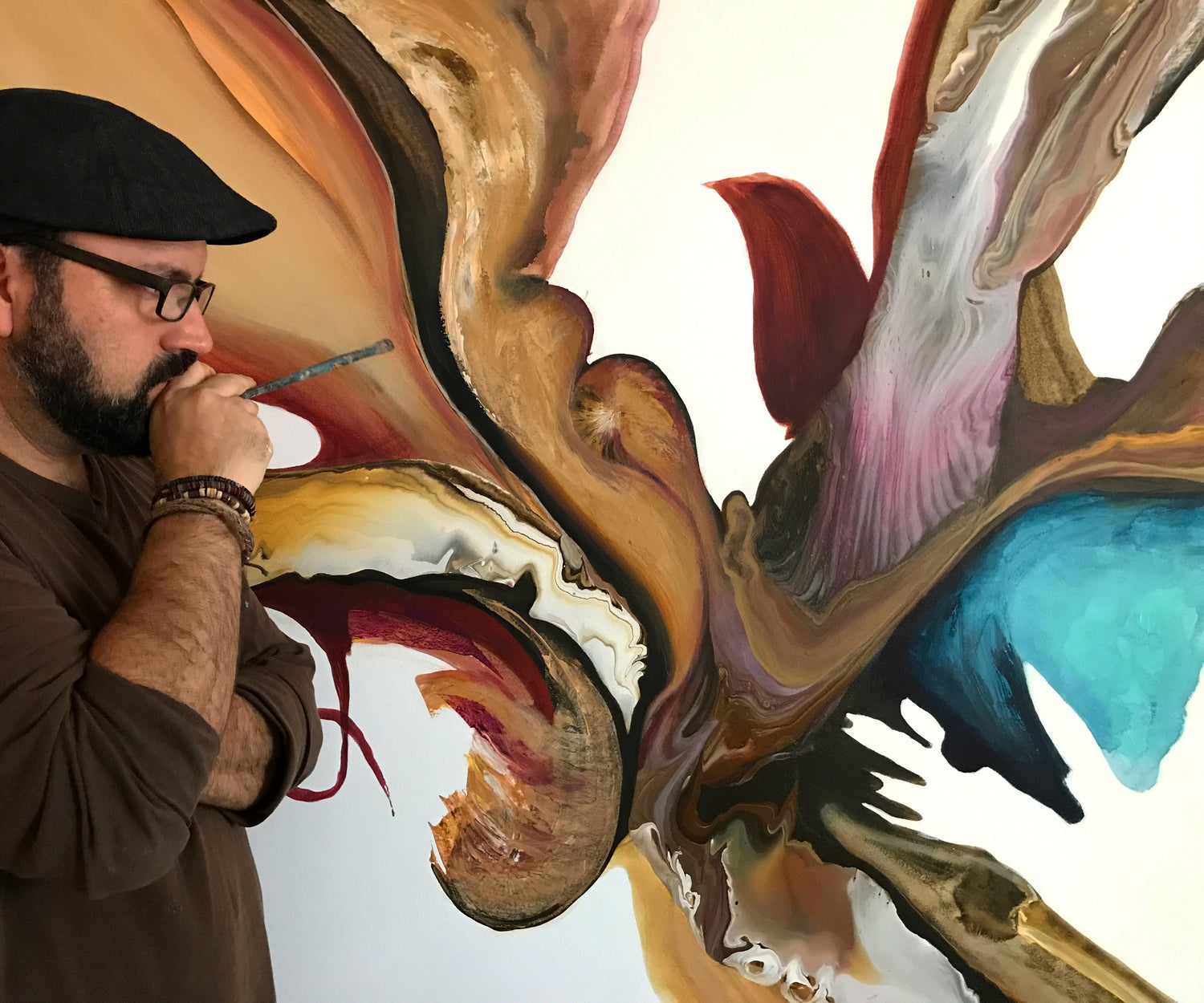 la Pintura para Marco Tulio es como un ritual donde los 4 elementos se entrelazan. De lo que al inicio parecen abstracciones, emergen estos patrones orgánicos y surrealistas que en armonía forman estas sinfonías visuales elementales. El viento y el agua entintada fluyen con el gesto, la tierra vibra y brilla con los polvos metálicos y el fuego arde como el acto creador...